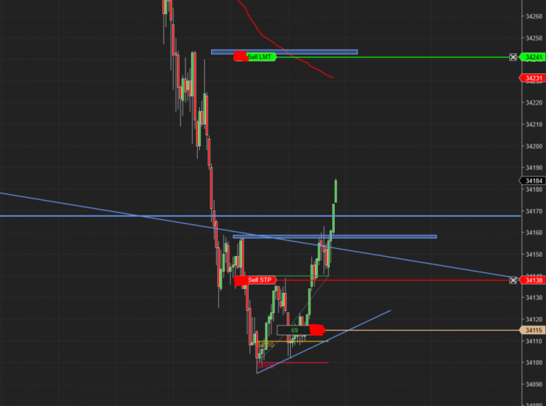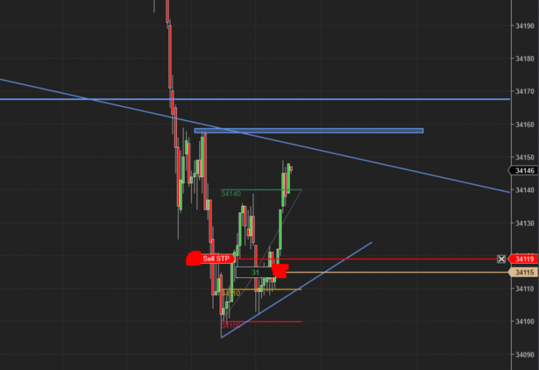 Oh I forgot to explain it is the M5 chart, that means the 5 minutes chart. Each candle lasts 5 minutes. Half of the position I sold at the local high around 34158. The rest became better and better. I never expected that but it was looking like a false breakout on the daily chart. So I expected a closing above 34170. Well done, the market runs straight into my sell limit.
